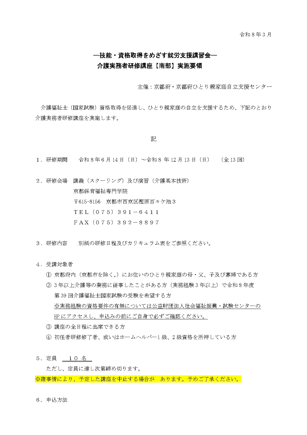 定員 10名 ただし、定員に達し次第締め切ります。受講希望の方はまず電話で来所の予約をお取りください